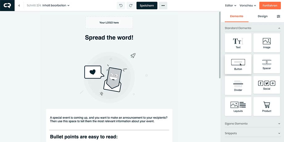 Ein ansprechendes Design ist entscheidend für den Erfolg deiner E-Mail-Kampagnen. Mit Cleverreach wird das Erstellen von professionellen Newslettern zum Kinderspiel. Nutze den intuitiven Drag-and-Drop-Editor, um Textfelder, Bilder, Buttons und vieles mehr einfach per Drag-and-Drop auf die gewünschte Position zu ziehen. Du kannst aus einer Vielzahl von vorgefertigten Templates wählen oder dein eigenes Design von Grund auf erstellen.